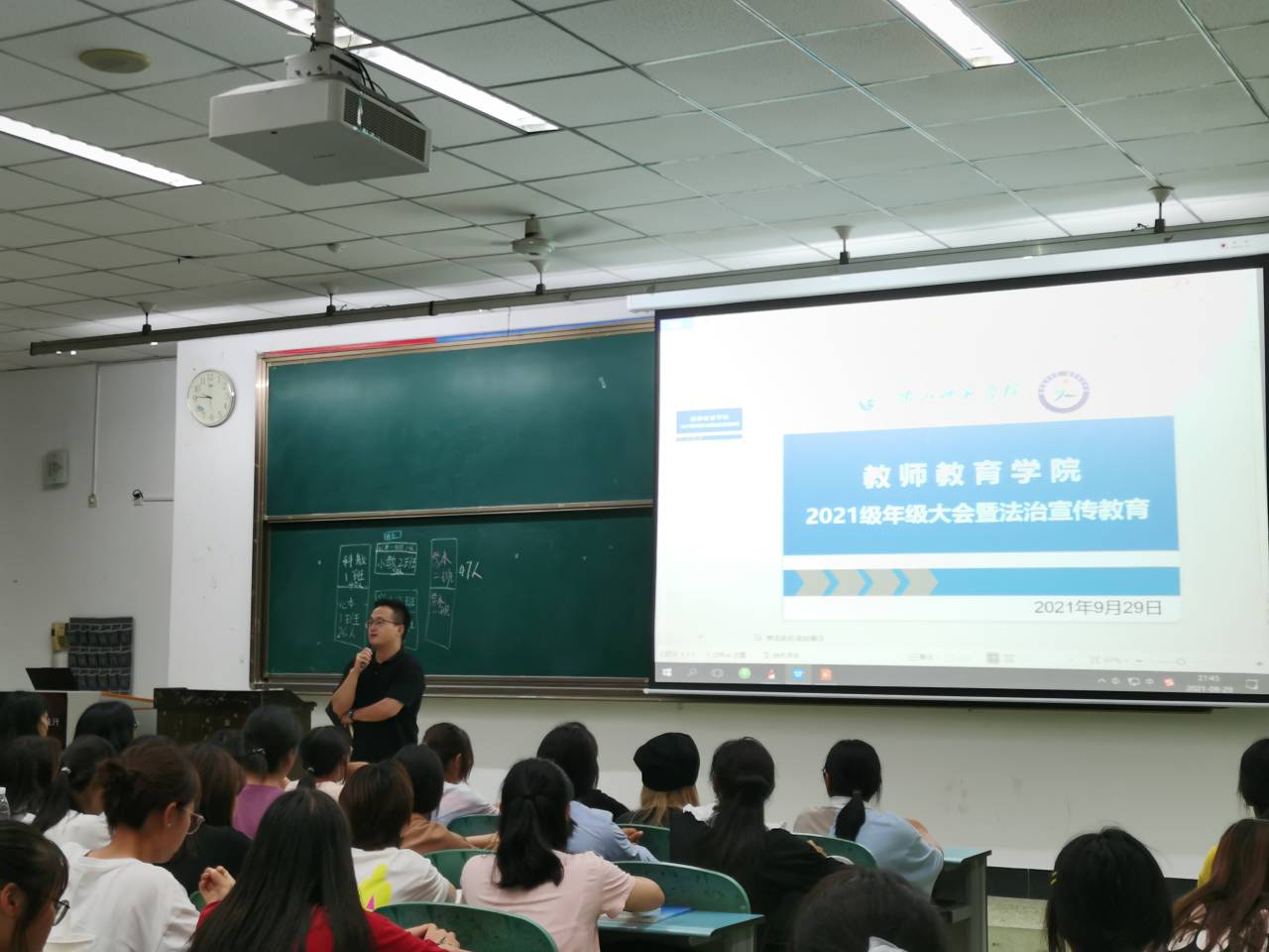 本网讯(文、图/冯紫君)9月29日中午,教师教育学院在行知楼101教室召开“法律进校园之依法治教”宣讲会。教院全体学生参加了此次会议,此次宣讲会由法学与公共管理学院徐瑞、吴维琪主讲。