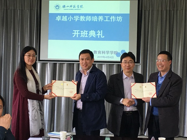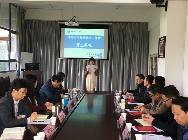 本网讯(文、图/廖思宇)2019年4月4日下午,教育科学学院在学院会议室举行了“阳初文化·乐教”卓越小学教师培养工作坊开班典礼。教务处副处长罗明礼,教科学院主持工作副院长谢艺泉、党总支书记杨霞等管理人员、乐山市部分小学校长和国家“万人计划”教学名师程远友以及卓越小学教师培养工作坊的指导老师和同学们出席了本次开班典礼。会议由教科学院分管教学副院长廖华平主持。