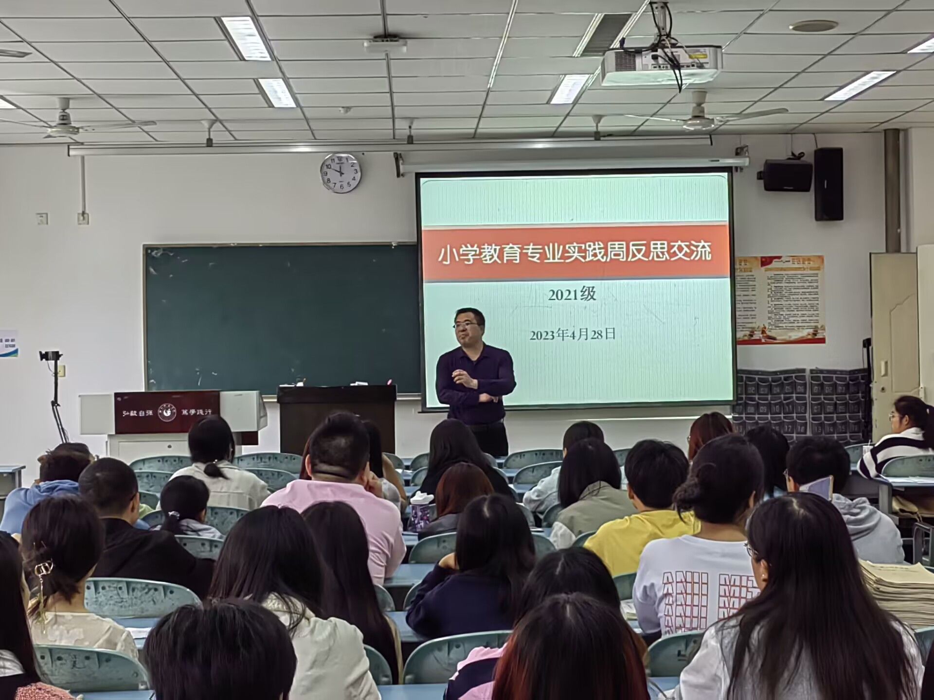 本网讯(文图/罗清)为了提高小学教育专业实践周见习实效,4月28日,在行知楼114和210教师分别开展了2021级、2022级小学教育专业实践周见习反思交流活动。小学教育专业部分老师及小学教育专业2021级和2022级全体学生参加了活动。