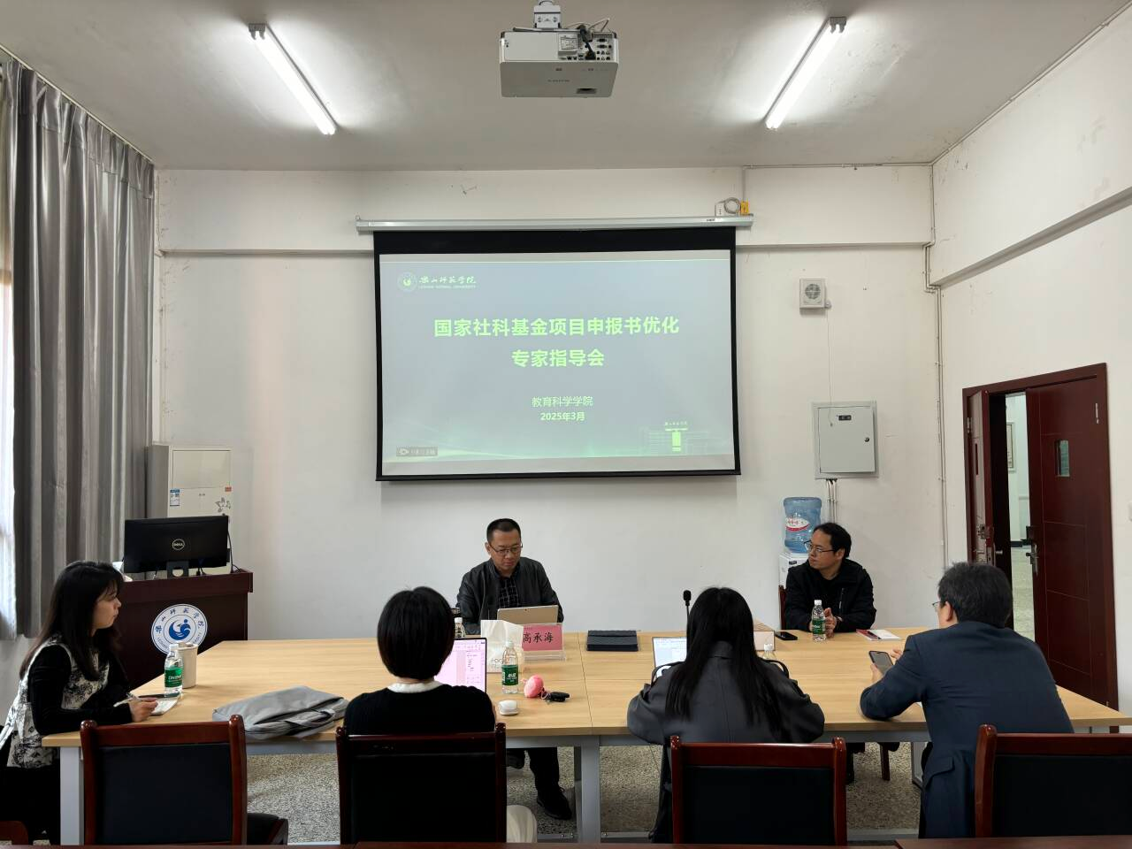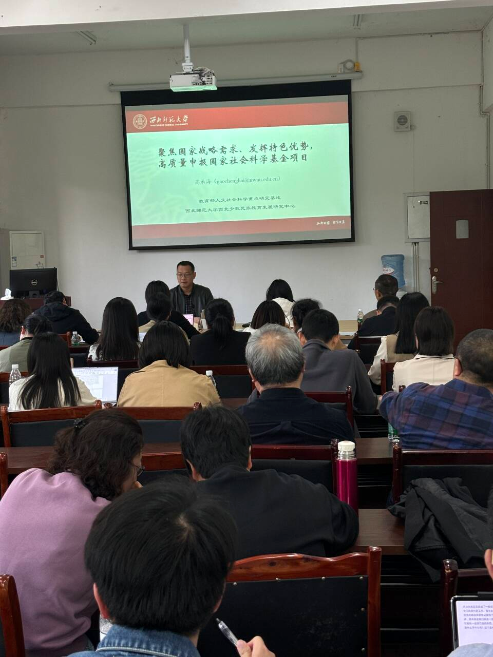 本网讯(图、文/滕冬冬)为做好2025年度国家社科基金项目申报工作,推进学科建设,助力应用心理申硕扩点,教育科学学院于2025年3月27-28日连续举办两场专题活动,特邀西北师范大学教育科学学院副院长、博士生导师高承海教授开展项目申报递进式指导。通过“经验分享+精准把脉”的双轨模式,构建从策略指导到实战优化的完整支持体系,提升教师项目申报竞争力。