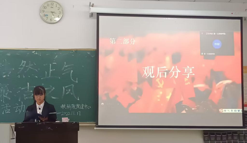 本网讯(文、图/贾琪)11月17日下午,教育科学学院于行知楼110开展“养浩然正气,育廉洁之风”主题党日活动,组织观看电影《金刚川》。教科学院全体党员参加此次活动。本次活动由张玉主持。