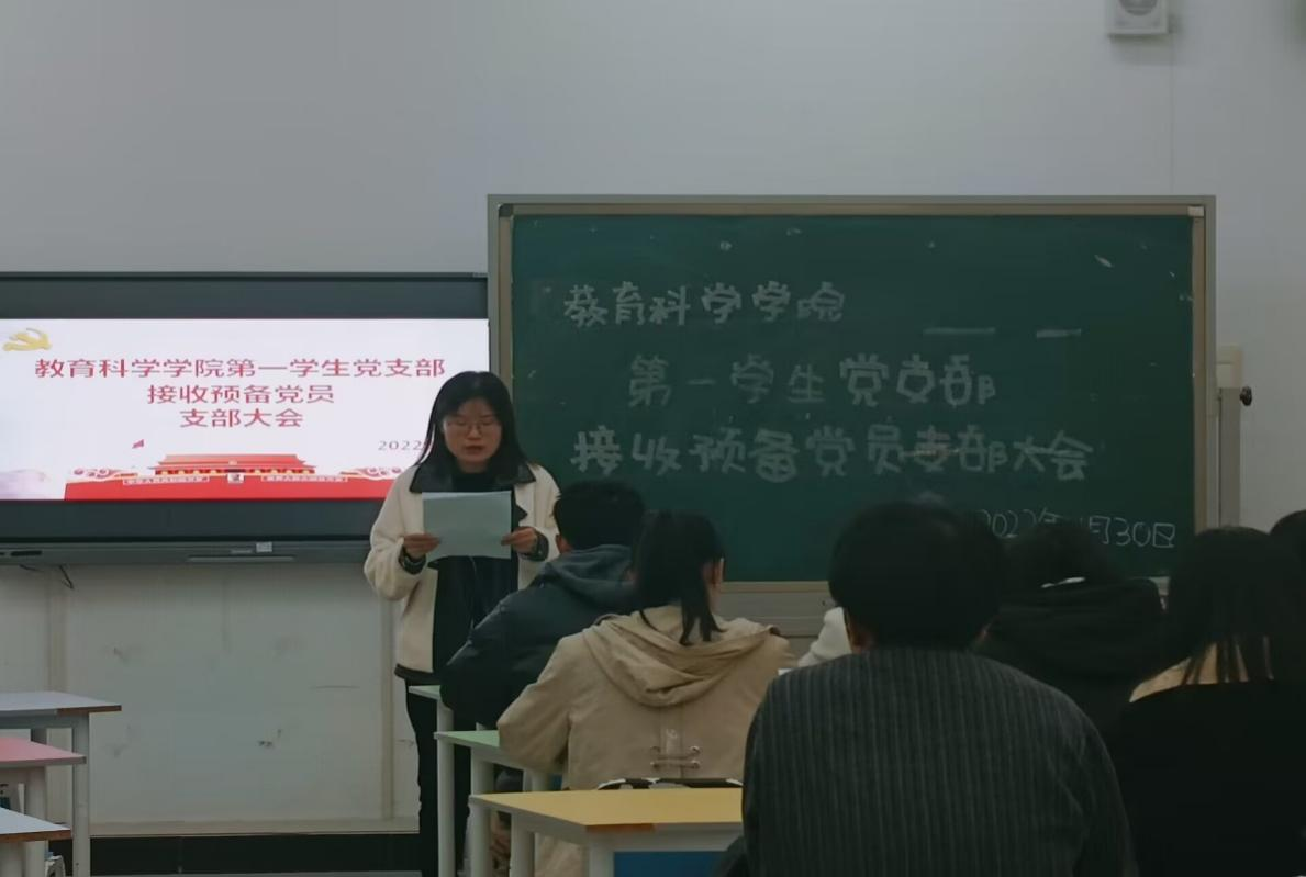 本网讯(文/王新雨、图/尹雪文)11月30日晚上,教育科学学院第一学生党支部和第三学生党支部分别召开支部大会讨论接收预备党员。参会人员有第一学生党支部书记杨蕾,第三学生党支部书记朱志刚以及全体学生党员和张慧美、缑月娇、朱俊妍3名发展对象。大会由各学生党支部书记主持。