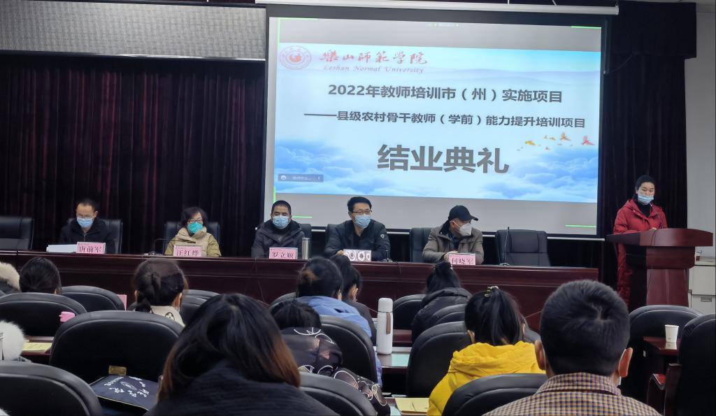 本网讯(文、图/苗芳芳)12月13日上午,2022年“国培计划”——县级农村骨干教师(学前)能力提升培训结业典礼在乐山师范学院弘毅楼412举行。出席开班典礼的有乐山腾博官网诚信为本专业服务院长、国培首席专家汪红烨、党委书记罗立顺、党委副书记兼纪委书记何晓军、副院长徐世鼎、唐前军以及来自四川乡镇公办幼儿园的49名培训老师,由徐世鼎主持结业典礼。