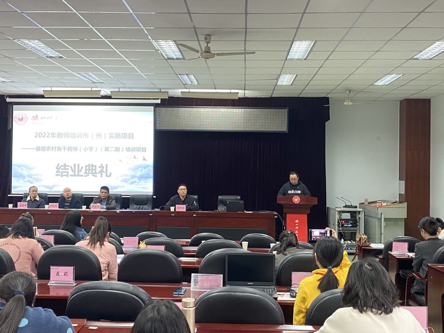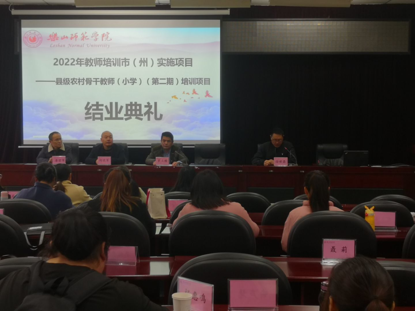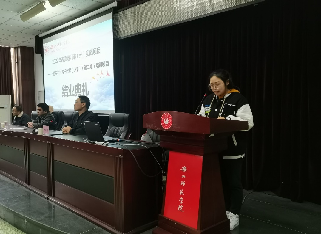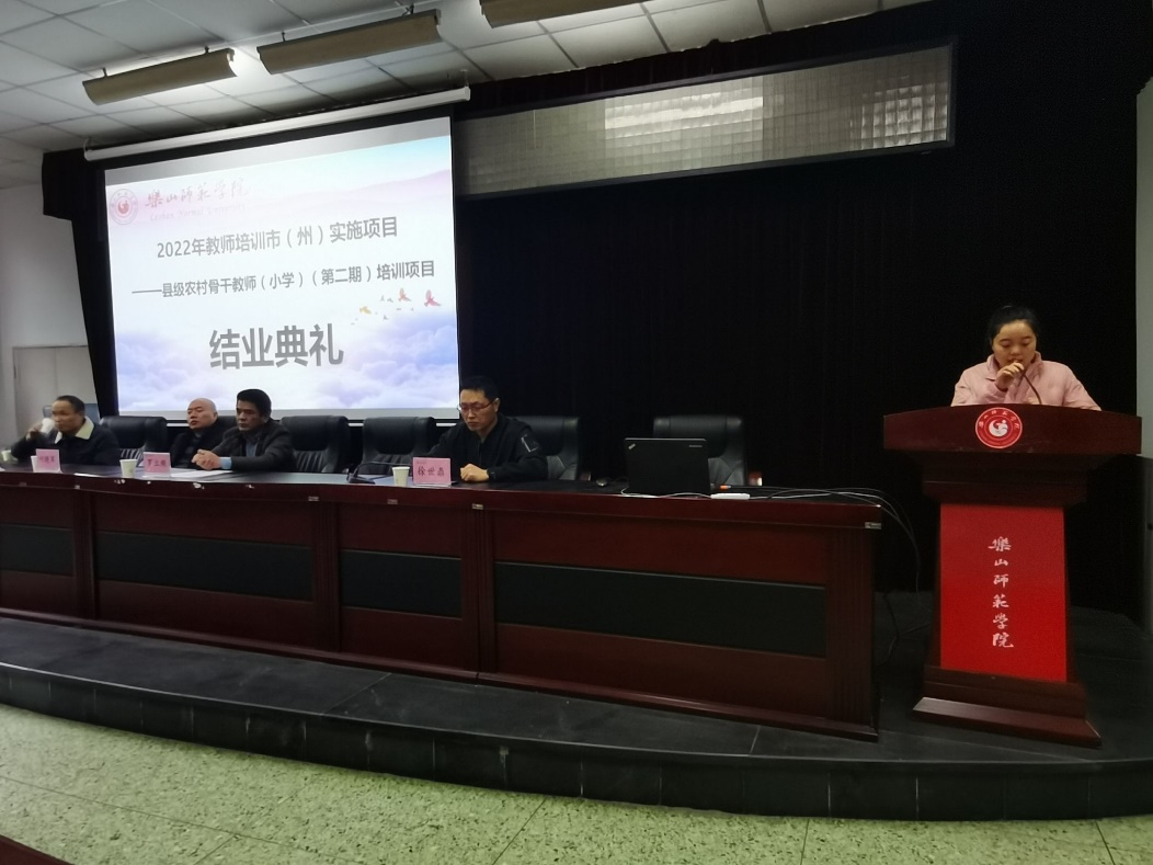 本网讯(文/冯紫君、图/雷仕美、缑月娇、蒲绍东)3月28日,2022年“国培项目”市(州)实施项目——县级农村骨干小学教师培训(第二期)结业典礼在弘毅楼413教室顺利举行。乐山腾博官网诚信为本专业服务党委书记罗立顺、党委副书记兼纪委书记何晓军、副院长徐世鼎、唐前军、教学班主任廖娅晖及47名学员参加了结业典礼。结业典礼由徐世鼎主持。