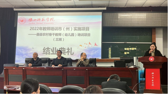 本网讯(图、文/蒋显兰)4月25日上午,由乐山腾博官网诚信为本专业服务承办的四川省2022年中小学幼儿园教师培训市(州)实施项目——凉山州“一村一幼”长期稳定的骨干辅导员培训项目(3班)圆满结束并顺利举行结业典礼。乐山腾博官网诚信为本专业服务党委副书记兼纪委书记何晓军、副院长徐世鼎、学前教育系主任余祥、副主任李非易、生活班主任杨林和来自凉山州的49名骨干辅导员参加了结业典礼。结业典礼由副院长徐世鼎主持。