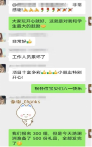 乐芽志愿者林雨彤感触良多,她提到:“我们从全校组建了60人的志愿者团队,在组织活动的过程中,我深深的感觉到组织一场活动真的很不容易,需要做计划协调,提前踩点等等……我们的工作人员真的辛苦了!看着孩子们欢乐嬉戏,爸爸妈妈们脸上也洋溢着幸福的笑容,小朋友展现出来的坚持与拼搏,这些都给我们留下了深刻的印象,让我们觉得这场活动办得很成功,大家的努力和付出都是值得的。”