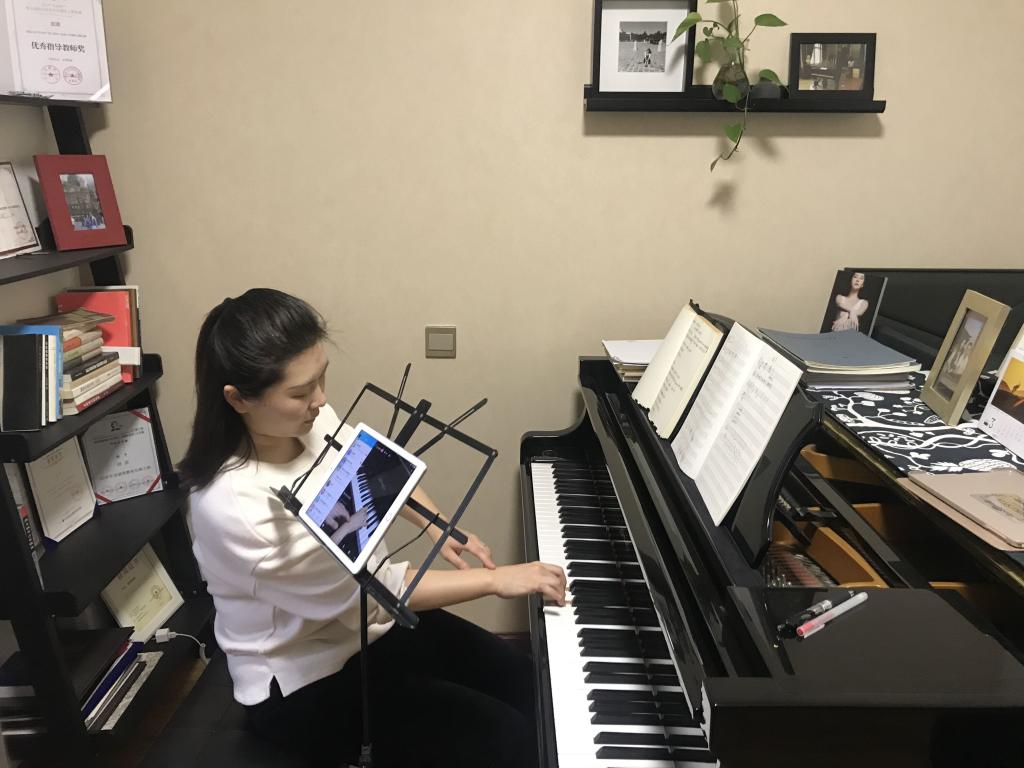 针对19级学前教育专业和18级小学教育专业的《键盘基础》课程,以讲授和示范为主,田老师在群课堂里一遍遍地示范弹奏,学生们同时进行手指的模仿性练习,并且不时点名连麦,抽查弹奏情况、监测教学质量、跟进学生在屏幕后的学习状态。同学们纷纷表示这样的教学方式很直观,能够清楚地看到老师的示范,对理解弹奏要点有很大帮助。由于大多数同学只能在家里的书桌上、茶几前进行手指练习,较为抽象,钢琴演奏专业出身的田苗老师还在课堂结束前同学们献上一首首钢琴曲,调节学生的学习情绪。