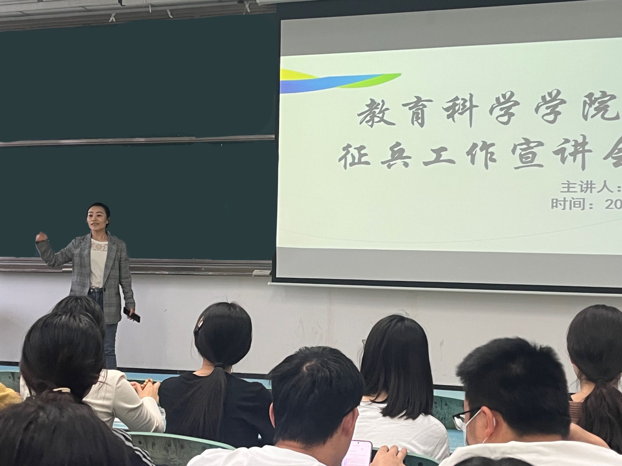 本网讯(文、图/贾琪)为鼓励学生积极应征入伍,推动学生了解应征入伍政策,5月22日晚,教科学院在行知楼101教室开展了大学生应征入伍政策宣讲。