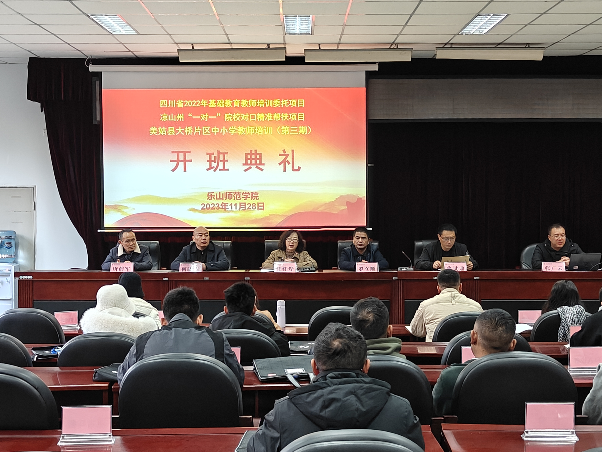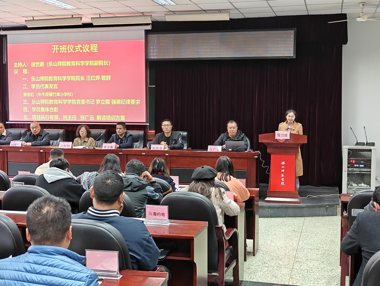 本网讯(文/蒲绍东、图/蒲绍东、陈诗崎)11月28日上午,四川省2022年基础教育教师培训委托项目——凉山州“一对一”院校对口精准帮扶项目(第三期)开班典礼在弘毅楼413教室成功举行。乐山腾博官网诚信为本专业服务院长兼国培首席专家汪红烨,党委书记罗立顺,党委副书记兼纪委书记何晓军,副院长唐前军,教师教育教研室主任张广云,赵增华、张源元及40名学员参加了此次开班典礼。典礼由副院长徐世鼎主持。