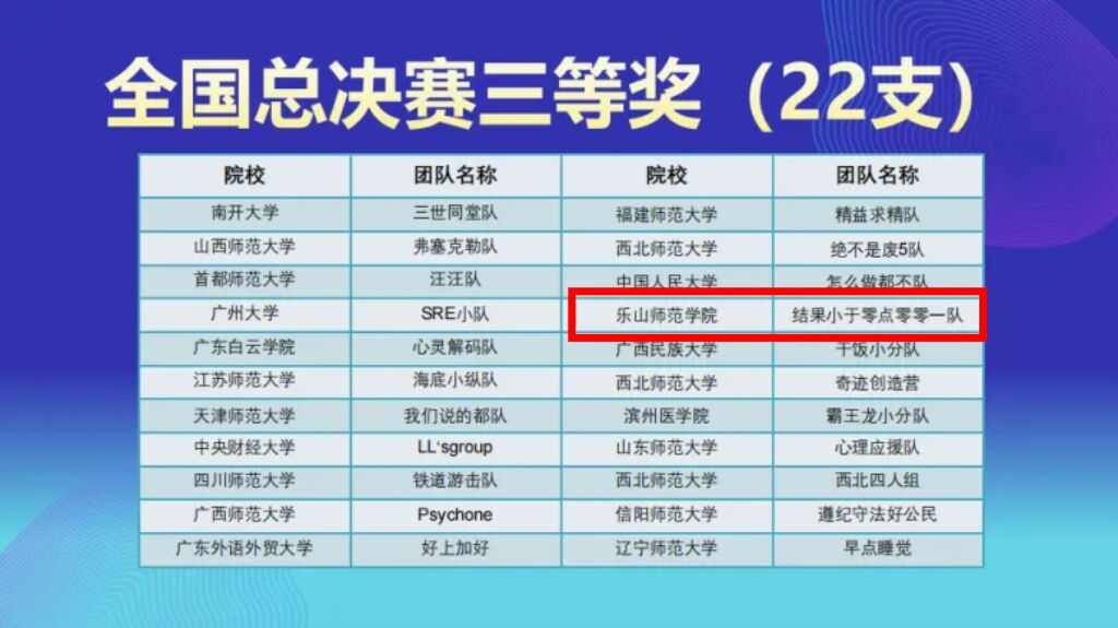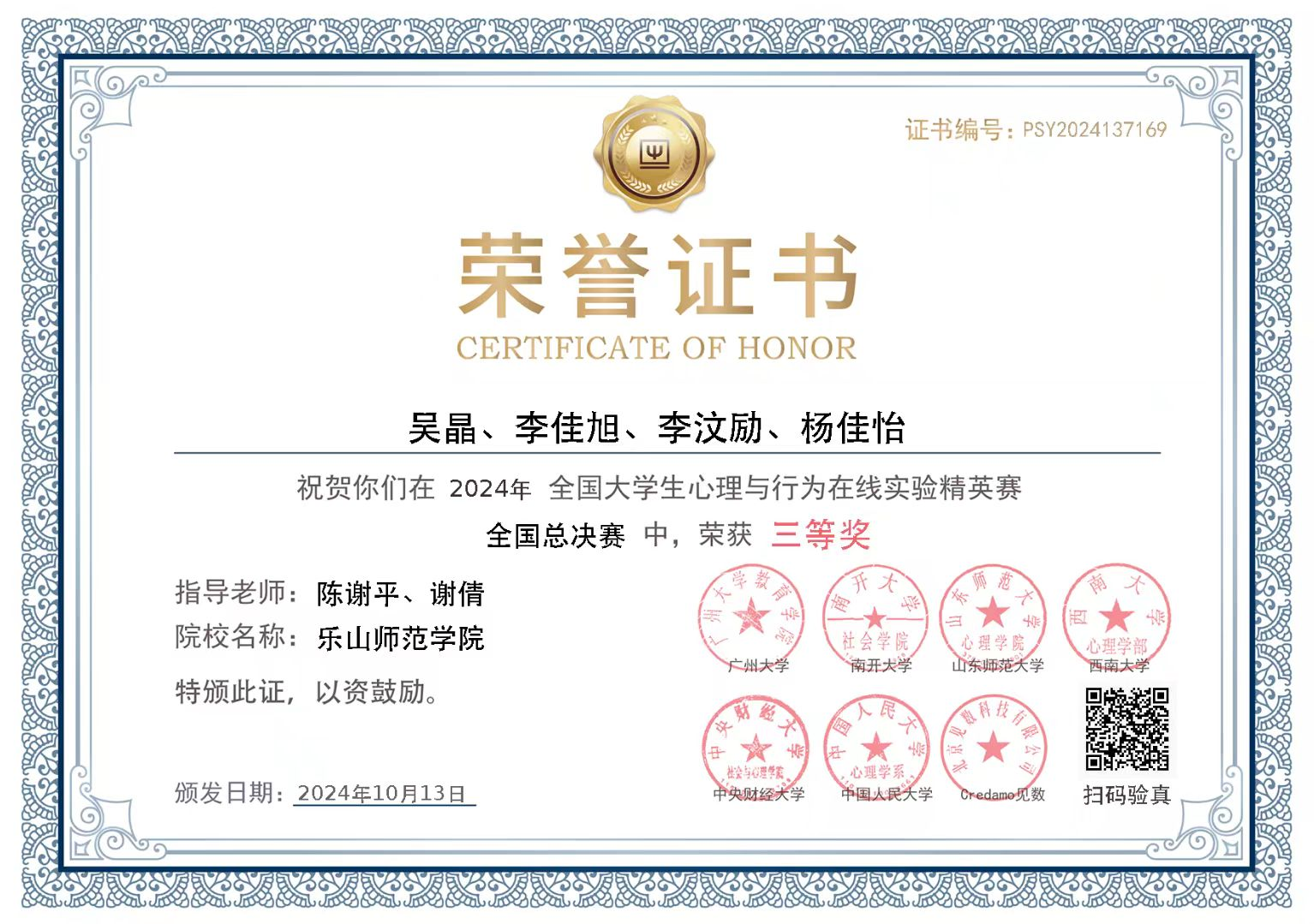 本次大赛自2024年5月1日正式启动以来,累计报名人数7122人,参赛高校总数共259所,覆盖全国30个省、自治区、直辖市。该项竞赛倡导通过在线实验模式灵活化的研究设计和多样化的研究功能,克服场地、时间等限制,响应互联网技术和大数据应用的快速发展,研究现实环境中的心理与行为现象,旨在提升参赛师生线上心理与行为实验研究设计、数据收集与分析能力。经过前期校级选拔赛、分赛区竞赛的层层选拔,最终来自东、西、南、北四个分赛区的共60个参赛团队成功进入全国总决赛。我院心理学专业学生所组建的队伍经历重重困难,靠着敢为人先的科创精神和不怕困苦的意志力量斩获佳绩。这其中离不开学生们的钻研品质,同时更离不开老师们的悉心指导。