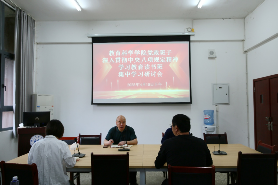 本网讯(图、文/童瑶)4月9日到11日,教育科学学院党委在学院会议室举行党政班子深入贯彻中央八项规定精神学习教育读书班研讨会。受党委书记罗立顺同志的委托,研讨会由党委副书记兼纪委书记何晓军主持。