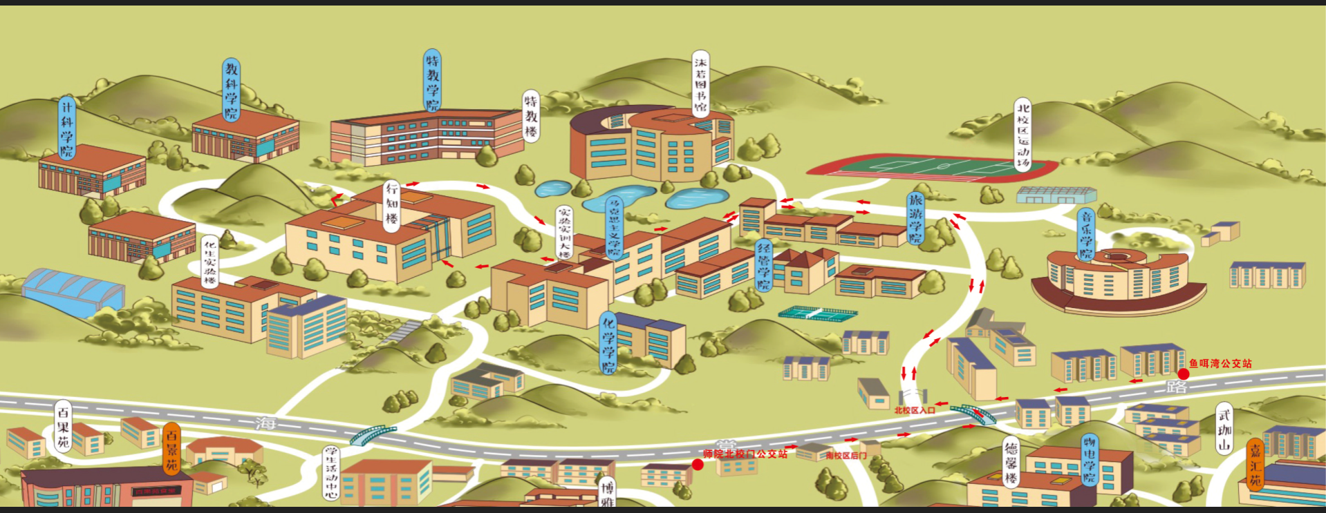 公交:6路、8路、10路、13路,在“鱼咡湾公园”站或“师院北校区”站下车。