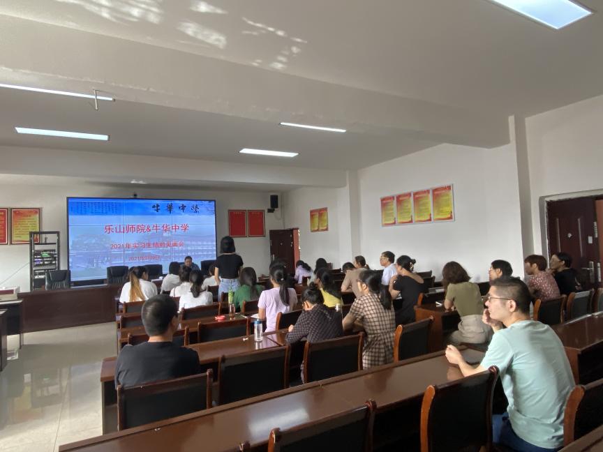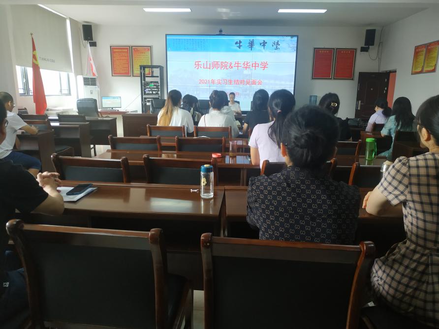 牛华中学谢主任热情的接待了我们,并为此次教育实习召开了“乐山师院&牛华中学”2021年实习生结对见面会。参与本次见面会的人员有来自乐山师范学院的12名实习生和牛华中学为每位实习生安排的学科教学实习指导老师和班主任工作实习指导老师。牛华中学谢主任和牛华中学实习带队教师张旭梅作为主讲人主持了本次见面会。