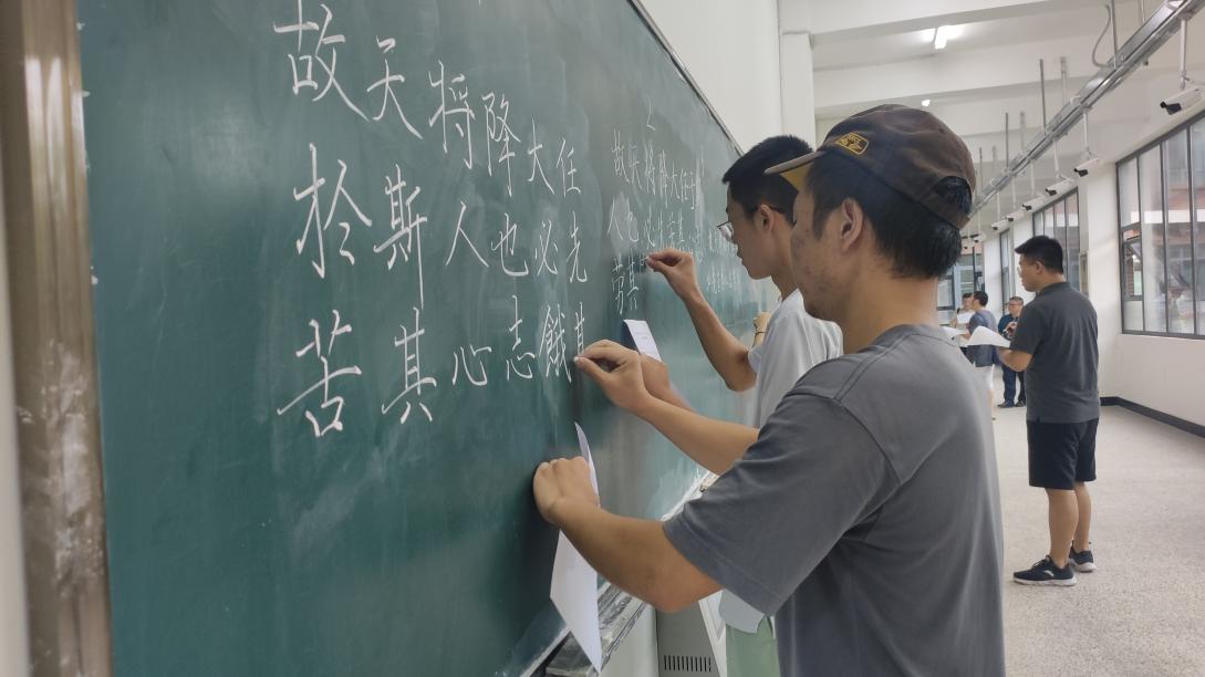 7月1日,决赛在弘毅楼407和405、教师教育学院一楼粉笔字书写大厅举行。决赛分为专业组毛笔,非专业专组毛笔、硬笔、粉笔、民族语言书写五个组别。参赛选手在规定时间内,根据命题,进行现场创作。书写内容旨在传承中华优秀语言文化、红色文化,书写中华经典,筑牢中华民族共同体意识。比赛开始后,选手们聚精会神,挥洒翰墨,笔走乾坤恢宏气,挥斥方遒。在同学们的笔下,一幅幅书法作品跃然纸上。钢笔字行云流水、隽秀挺拔;毛笔字苍劲有力,沉雄朴茂;粉笔字方正疏朗,收放有度。