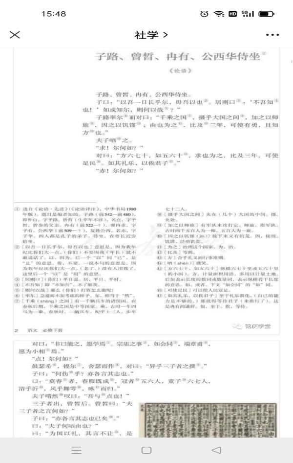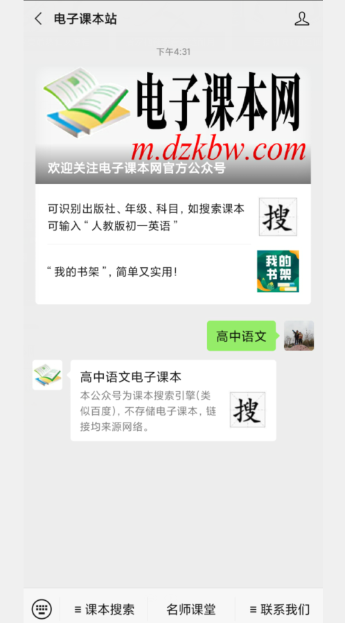 2.进入电子课本站公众号对话框,输入搜索需要查找的学科。如“高中语文”