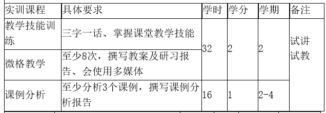 通过创设模拟的实践环境,学生了解中小学校教育教学工作,训练教育教学行为,塑造优良教师文化的过程。校内实训不少于32学时,主要任务包括教材分析、教学设计、教学实施、教学评价以及教学语言运用、板书、新媒体使用等模拟练习。采取课例分析、说课、微格教学、教育教学技能等形式实施校内实训。校内实训应在第2学期完成。
